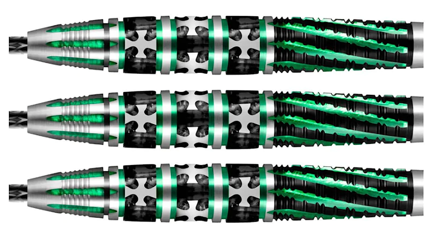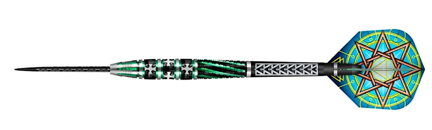 Mist and Mystery. The highest-ranking and most learned among all the Celts, the Druid embodies the sacred soothsayer and seer of ancient Britain’s wild, mist-shrouded places. This 90% tungsten, pencil shaped barrel is wreathed in forest green over black titanium. A long curved, tapered nose features raised arrowhead Vs for clear finger placement. In the mid-section, a forceful Rebellion grip. At the rear, the ringed Alchemy grip with its V cuts overlaid with spirals – the perfect foil for Rebellion when rolling the darts in your fingers. Consult the inner wisdom of Druid before entering the fray, and you shall surely emerge victorious.