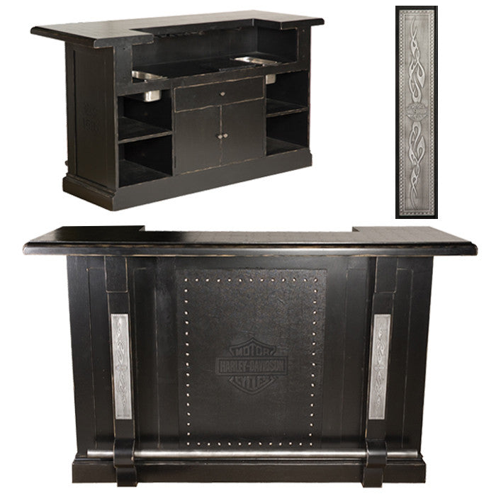 The H-D¨ Bar & Shield Flames Bar brings a classy ruggedness to your home or bar entertainment area. Made with North American hardwoods and hardwood veneers this vintage black, distressed, and hand rubbed finish with antique pewter accents sets the bar for entertaining your friends and enjoying your favorite beverages. The front panel is covered with reconstituted leather which is embossed with the classic Harley-Davidson¨ Bar & Shield graphic and accented by hand set studs. The front panel is complimented by hand finished Bar & Shield flames plates on the left and right and the laser etched ‰›�Est. 1903‰ panel on the ends of the bar are the finishing touches on this beautiful piece of furniture. Functionality is a key part of every bar and with a bar surface made with reconstituted leather, a cutting board, stainless steal dry sinks and a stemware rack, this bar combines functionality with style! The bar also features dual display shelves, a cabinet and a drawer to provide you ample space for storage. Comes fully assembled. Also available in Heritage Brown stain (see HDL-13000-H).