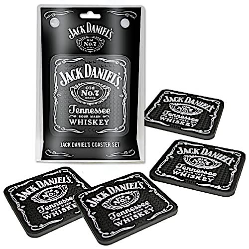 Black Jack Daniels rubber coaster set. Features the "Jack Daniels" logo and is made from no slip, textured PVC rubber. Comes in a set of four and measures 3.5"(W) X 3.5"(H) individually.