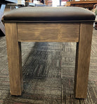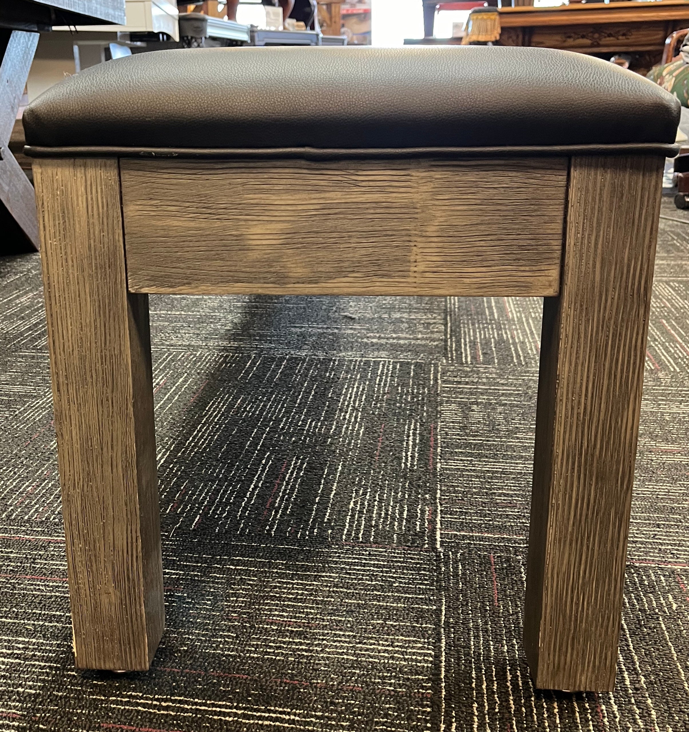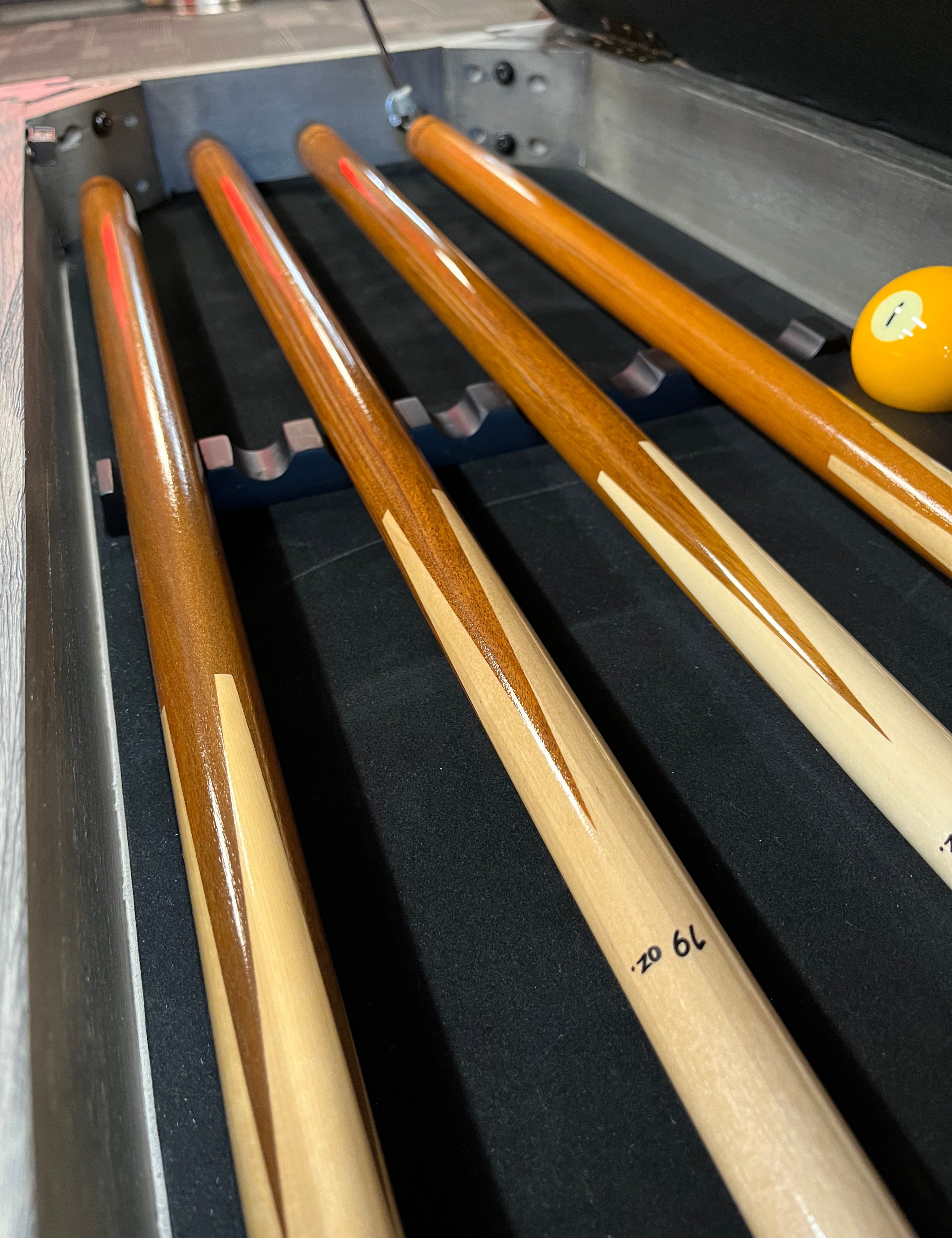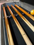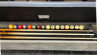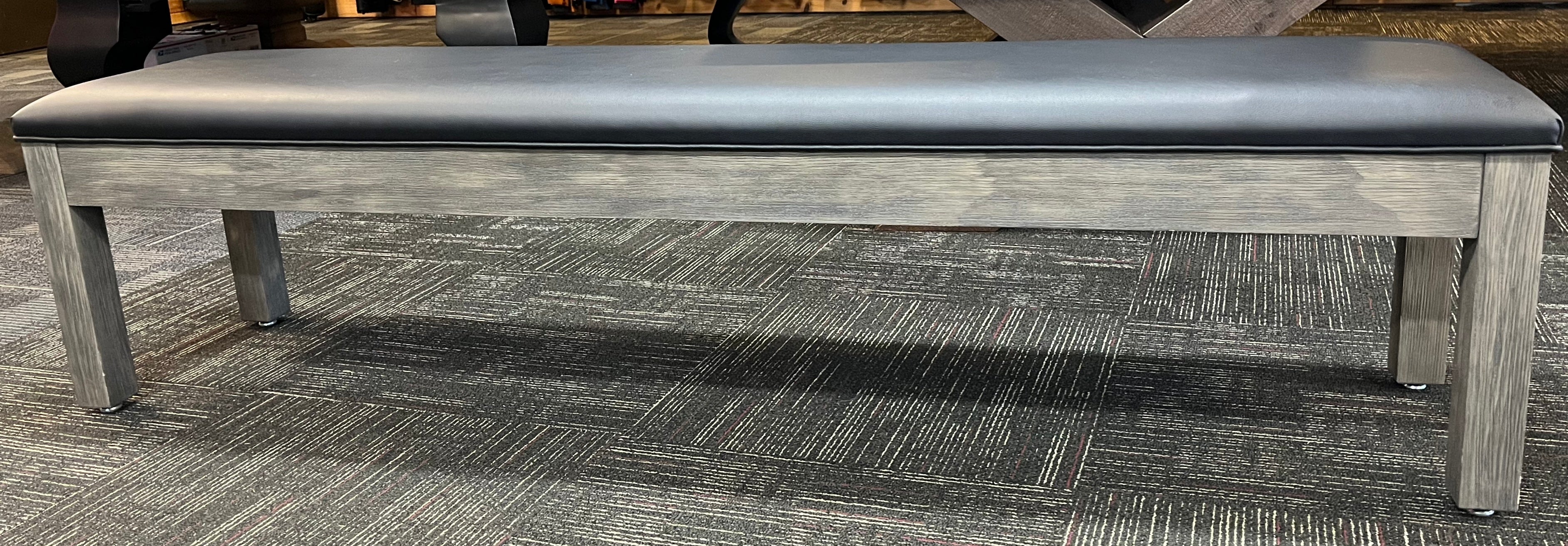 This weathered grey storage bench is brand new. The dimensions are 75" long x 17" wide x 19" high off of the floor. It has a padded leatherette black cover and storage for a full set of pool balls, 8 cues (7 if the balls are stored at the same time), both an 8-ball triangle and a 9-ball rack, chalk, and a table brush. A bridge stick could occupy one of the cue slots. The lid is held open by two pneumatic pistons, one on each end.