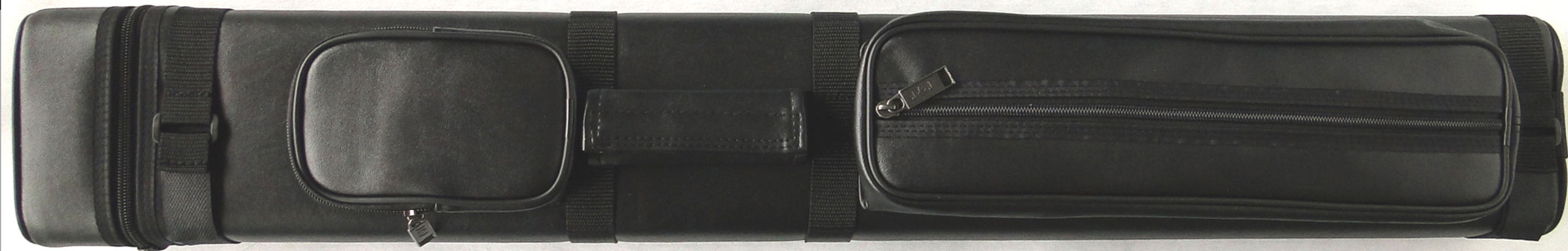 This is a 3 butts 5 shafts case, traditional design, hard shell, satin dividers inside, with 2 pouches, handle and shoulder strap.