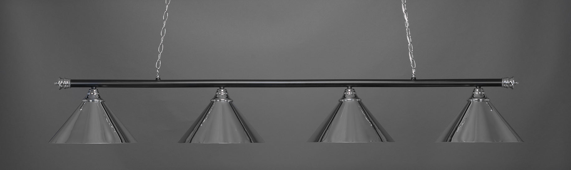 The 374-CHMB-420-CH light from Toltec is part of their Oxford series and is an excellent non-traditional choice for contemporary billiards table or island lighting. It is rated at 120V for indoor use and is designed for hardwired installation. The 374-CHMB-420-CH requires 4 Incandescent bulbs. Includes manufacturer 1-year warranty. Some assembly required (instructions included).