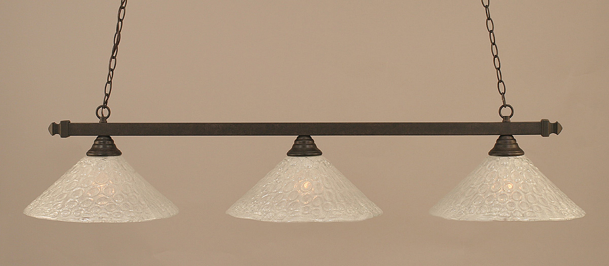 The 803-DG-411 light from Toltec is part of their Square series and is an excellent non-traditional choice for contemporary billiards table or island lighting. It is rated at 120V for indoor use and is designed for hardwired installation. The 803-DG-411 requires 3 Incandescent bulbs. Includes manufacturer 1-year warranty. Some assembly required (instructions included).