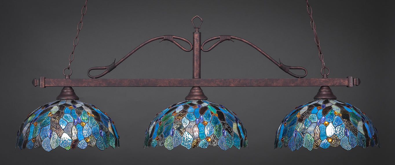 The 823-BRZ-995 light from Toltec is part of their Scroll series and is an excellent non-traditional choice for contemporary billiards table or island lighting. It is rated at 120V for indoor use and is designed for hardwired installation. The 823-BRZ-995 requires 3 Incandescent bulbs. Includes manufacturer 1-year warranty. Some assembly required (instructions included).
