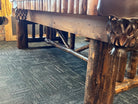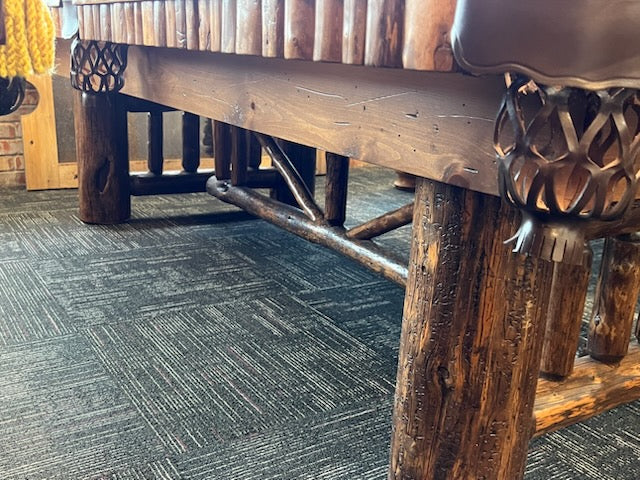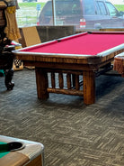 Like new, this table has brown leather shield pockets and an awesome rustic design! Incredibly heavy duty construction, perfect for your cabin, lodge, or serious man cave. Unique pocket attachment plate prevents rail splits and wallowing out that can occur on other models. As always, our price includes your choice of felt colors from our ProLine Classic color palette, a play package with everything you need to start playing, and delivery and installation within a 30 mile radius of Loganville, GA. If you are not within our local service area, please call for any additional delivery fees.