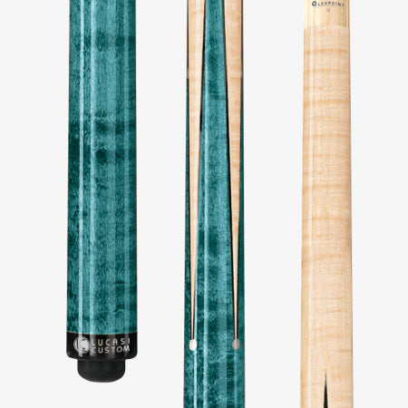 This classically-styled Lucasi Custom sneaky pete-style cue features a four-point antique teal design with mother-of-pearl dot inlays, Curly Maple forearm, wood-to-wood quick-release Uni-loc joint, and Zero Flexpoint Solid Core Low Deflection technology shaft.