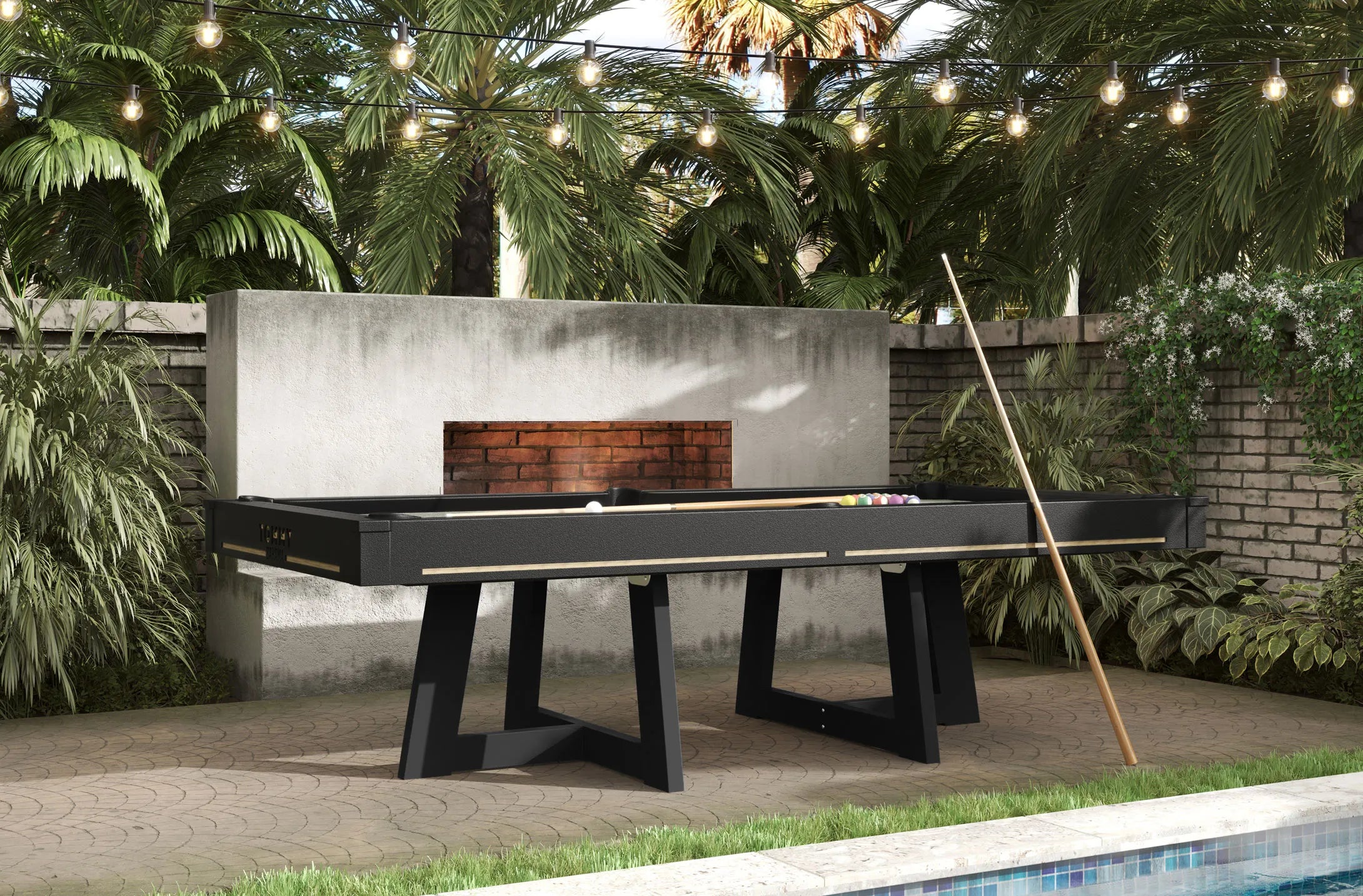 Since Tommy Bahama is the #1 brand in the outdoor living category, R&R Outdoors knew they had to create a collection for them. This Tommy Bahama outdoor pool table can be styled to compliment their South Beach line. The dark graphite finish highlights both your choice of Cast Slate or Cast Silver, enabling you to create a look that is uniquely yours. Using true Sunbrella™ fabric for your playing surface ensures durability, cleanability, and fast play. This table with its inlaid teak accents is a work of art and definitely turns heads. Playpack on this spectacular table includes two one-piece fiberglass sticks, triangle, bridgehead, matching chalk and standard ball set.