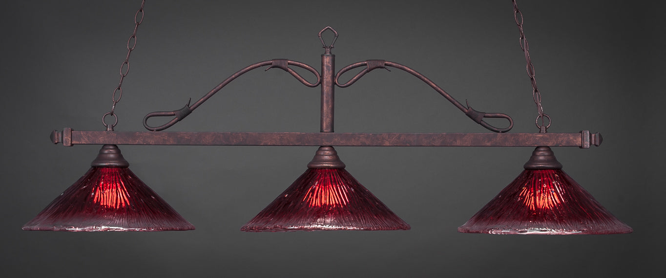 The 823-BRZ-716 light from Toltec is part of their Scroll series and is an excellent non-traditional choice for contemporary billiards table or island lighting. It is rated at 120V for indoor use and is designed for hardwired installation. The 823-BRZ-716 requires 3 Incandescent bulbs. Includes manufacturer 1-year warranty. Some assembly required (instructions included).
