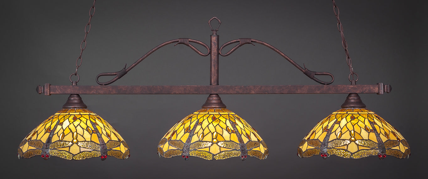 The 823-BRZ-946 light from Toltec is part of their Scroll series and is an excellent non-traditional choice for contemporary billiards table or island lighting. It is rated at 120V for indoor use and is designed for hardwired installation. The 823-BRZ-946 requires 3 Incandescent bulbs. Includes manufacturer 1-year warranty. Some assembly required (instructions included).