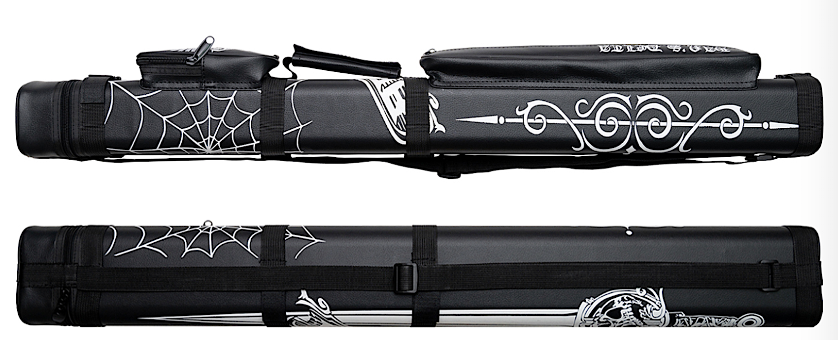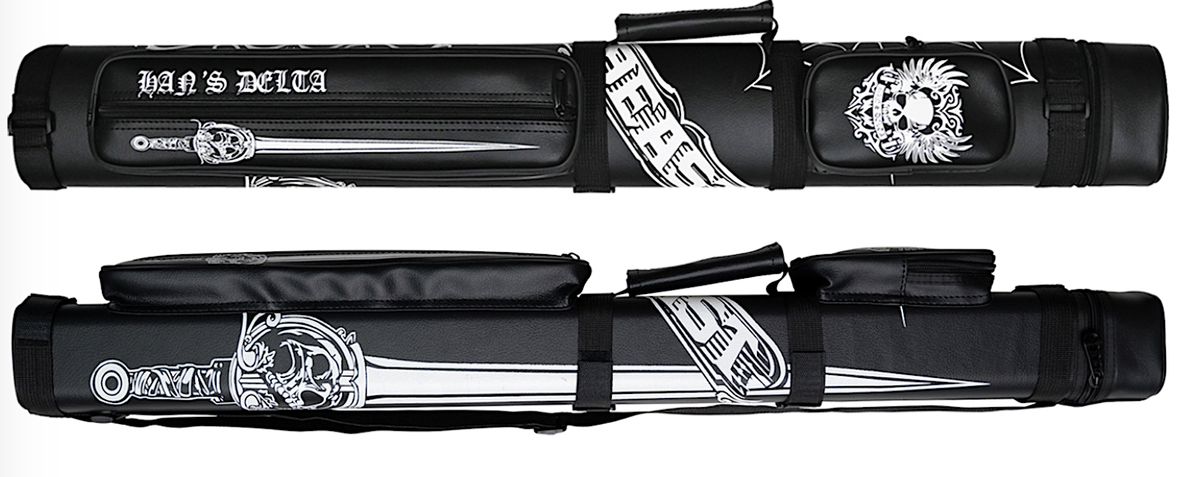 This Hans Delta 2 X 2 Hard Pool Cue Carrying Case features attention getting Beast graphics. Vinyl covering. Holds 2 butts and 2 shafts - Adjustable shoulder strap. This item measures 32" in length X 4" 3 1/4" - Small pocket measures 6" X 4" X 1 1/2", Large pocket measures 14" X 4" X 1 1/2", Divider tubes goes all the way into the case. Oval shape.