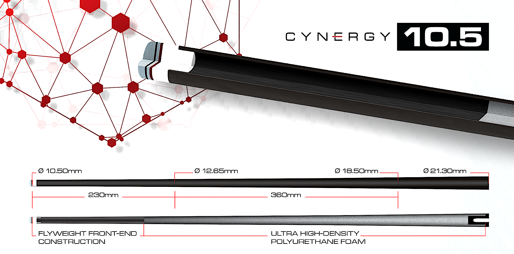 The Cuetec Cynergy 10.5 Carbon Fiber Composite Shaft provides Small-Ball and ultra-small diameter players with tremendous power delivery, paired with exceptional accuracy. Designed and developed with the input of the Cuetec Pro Team, English Black-Ball players, Chinese 8-Ball Players and Snooker Players across the globe, each Cynergy 10.5 is wrapped with a unique pattern of spun 15K carbon fiber tow, reinforced by Cuetecs proprietary poly-foam core. Every 10.5 utilizes a performance engineered hybrid-conical taper for increased energy transfer in both large table and heavy (slow) cloth environments, an ultra-thin white sighting ferrule, and laminated Tiger Sniper tip to create a multi-disciplinary shaft that is engineered for pure potting perfection.