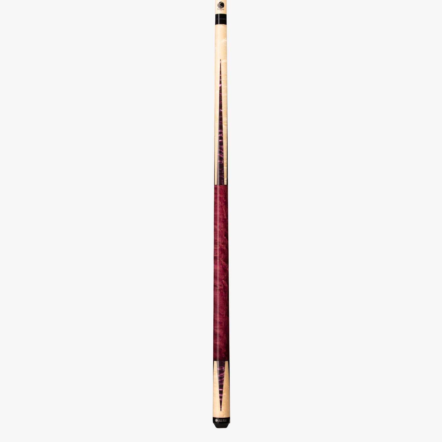 This sleek and simple Lucasi Custom cue features a natural super Birdseye Maple forearm and butt with four-point Purple crush inlays, Purple stained super Birdseye Maple wrapless handle, slim natural wood butt cap, quick-release Uni-loc joint, and Zero Flexpoint Solid Core Low Deflection Technology Shaft.