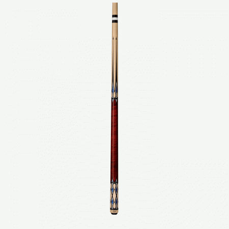 This modern traditional Rage cue features 100% Hard Rock Maple construction with natural Maple forearm and butt, graphic black and white points with blue diamond accents, Implex joint and sleek wrapless handle.