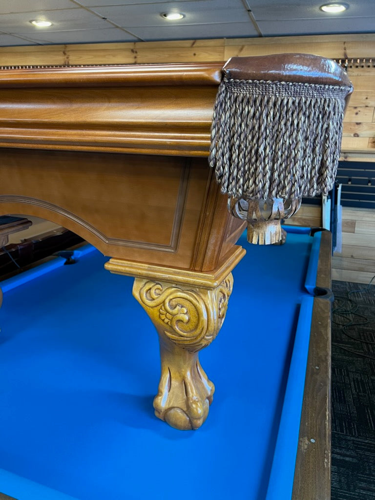 Like new! Built in August 2001, this table is pristine. Honey Maple stain with carved-knee ball and claw legs. This table also has brand new, life time guaranteed K66 cushions installed in our workshop. This is a fantastic addition to your game room.