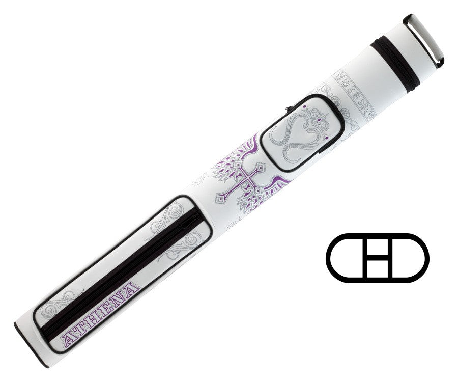 The Athena ATHC16 hard case will hold 2 butts and 2 shafts with a small and large accessory pocket. You can carry the case by either the top handle or the shoulder strap. Between the pockets is a Phoenix Rising and trimmed with accent designs
