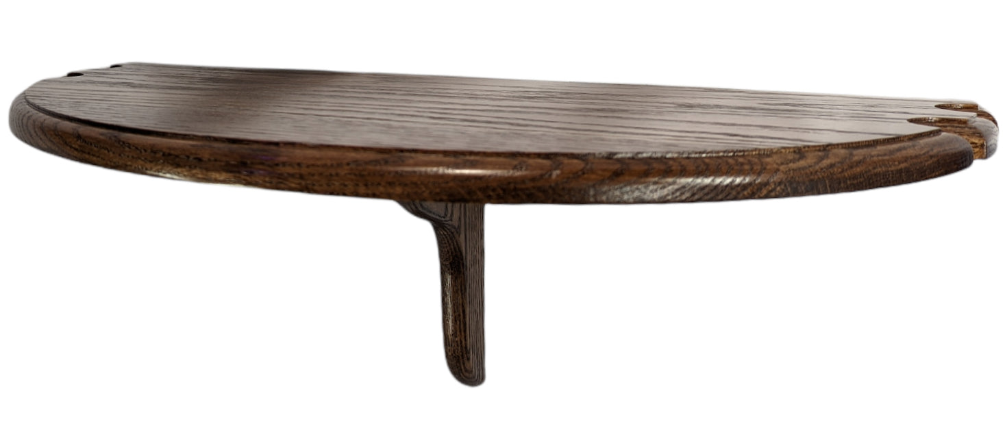 The half moon wall mount pub table by Denman Designs is handcrafed in Monroe, GA with the highest quality in mind. Each table is hand built and inspected by Seth Denman himself. This particular model is made from solid American red oak hardwoods and is finished with a beautiful dark walnut stain and durable lacquer that is sure to impress. The lower bottom mount features two key hole mounts that fit the included hardware perfectly and give the table a floating shelf appearance. This wall-mounted space saver pub table includes four pool cue stick slots and will fit in just 12-inches of space. No assembly Required. Easy To Install.