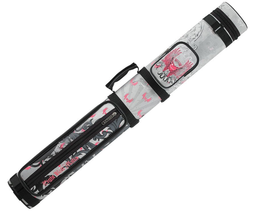 Eight Ball Mafia may be all about the rough and tumble, but that doesn't mean the brand doesn't have a softer side. This pool cue case was made just for the ladies, featuring pink winged hearts screened over durable black and grey vinyl. Not only does this pool cue case keep two full pool cues safe and secure, but it also features a design that perfectly matches the popular EBM11 winged hearts pool cue. As with everything from Eight Ball Mafia, this case includes a 1 year manufacturer's warranty.