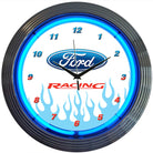 Neonetics Neon Clocks feature a hand blown ring of real glass neon, generating 25 watts of light. The neon clocks have glass faces and feature chrome finished, multi-tiered art deco styles rims. This clock features a chrome rim with a single ring of blue neon. The quartz movement clock operates on one AA battery (not included). The neon light is powered by an AC adapter (included) that plugs directly into a wall outlet. Give your home the fabulous glow of real neon! Product Name: Ford Racing Neon Clock Condition: Brand New In Manufacturer's Packaging Dimensions: 15" Diameter x 3" Deep Light: Hand Blown Glass 25 Watt Neon Clock: Quartz Movement (Operates On One AA Battery - Not Included) Clock Hands: Hour, Minute & Second Power Source: AC Adapter (Included) That Plugs Into American Standard Wall Outlet Rim: Multi-Tiered Art Deco.
