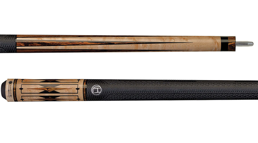 This limited edition traditional-style Lucasi Hybrid cue features a natural Super Birdseye Maple forearm and butt with exotic six-point Bocote & black inlay points, Bocote & black windowpane diamond accent inlays, stacked Bocote & black rings, wood butt cap and Quick-Release Uni-Loc joint and Zero Flexpoint Low Deflection Technology Shaft. Additional technology shaft upgrades available.