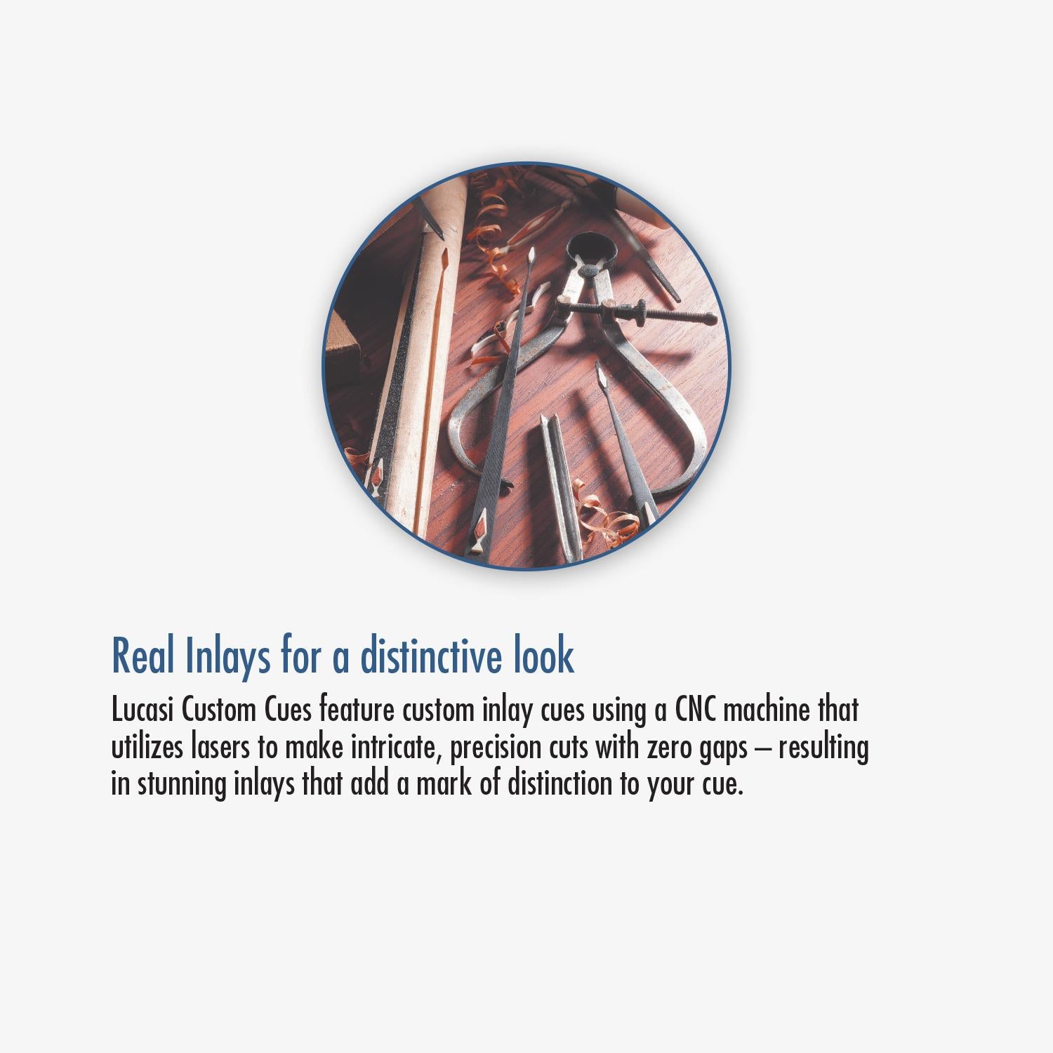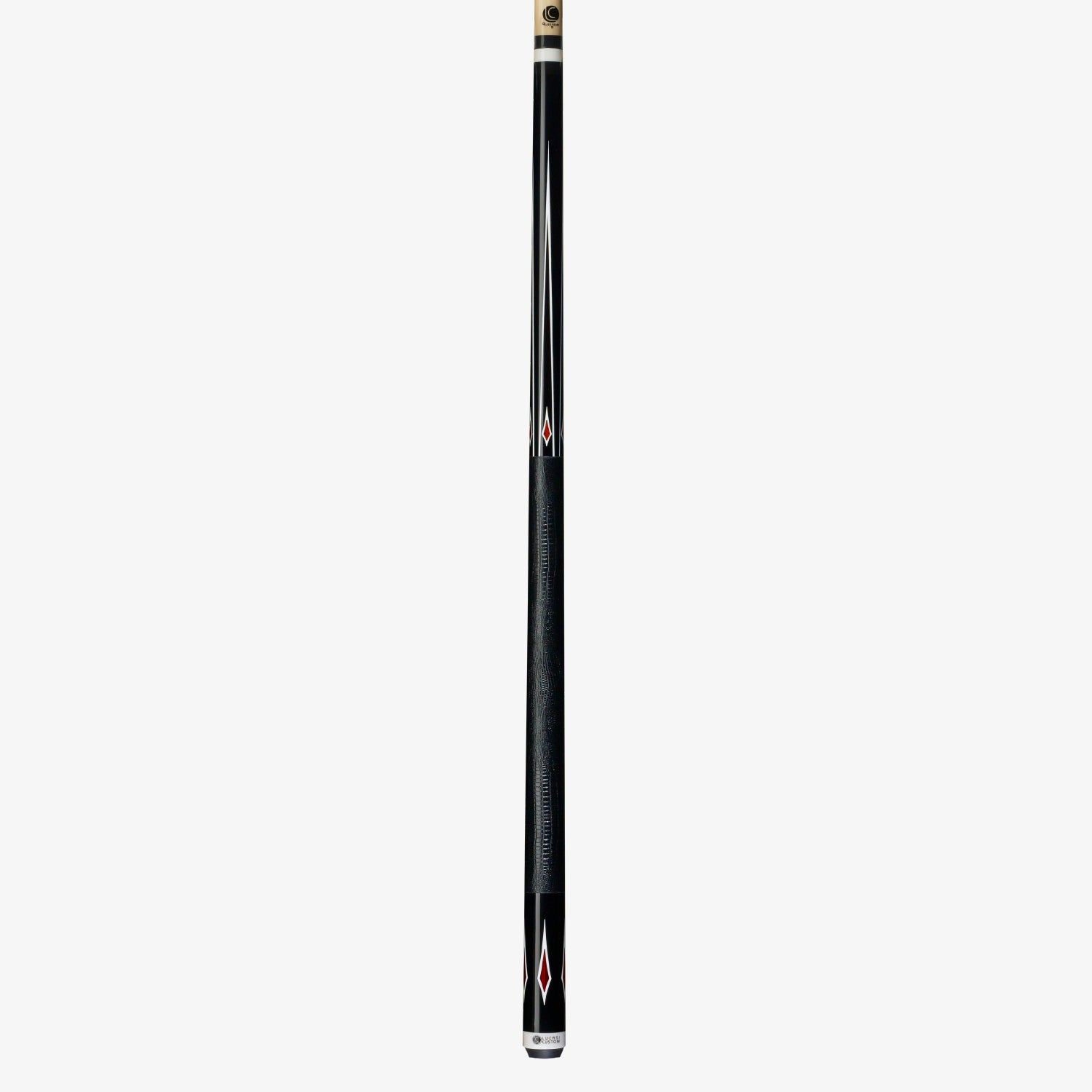 This sleek and simple Lucasi Custom cue features a Mystic Black maple forearm and butt with black diamond points outlined in natural and black, exotic bocote bands bordered by black and silver rings, blue stained curly maple wrapless handle, slim natural wood butt cap, 3/8 x 10 custom joint, and Zero Flexpoint Solid Core Low Deflection Technology Shaft. Additional technology shaft upgrades available.