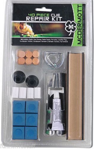 The McDermot 40-Piece Repair Kit provides you with everything you need to replace your tip, and keep your valuable investment protected. Features: 12 Leather tips (6-12mm and 6-13mm), 2 Cue Clamps, 2 Rubber Bumper Ends, Tip Sander, 4 Ferrules, 6 Blue Chalk Cubes, Tip Cement Glue, 2 Table Spots.