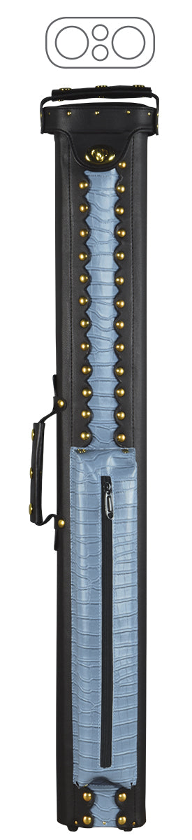 - Hard Cue Case w/ Vinyl with colored Alligator-embossed vinyl accents & brass rivets Exterior