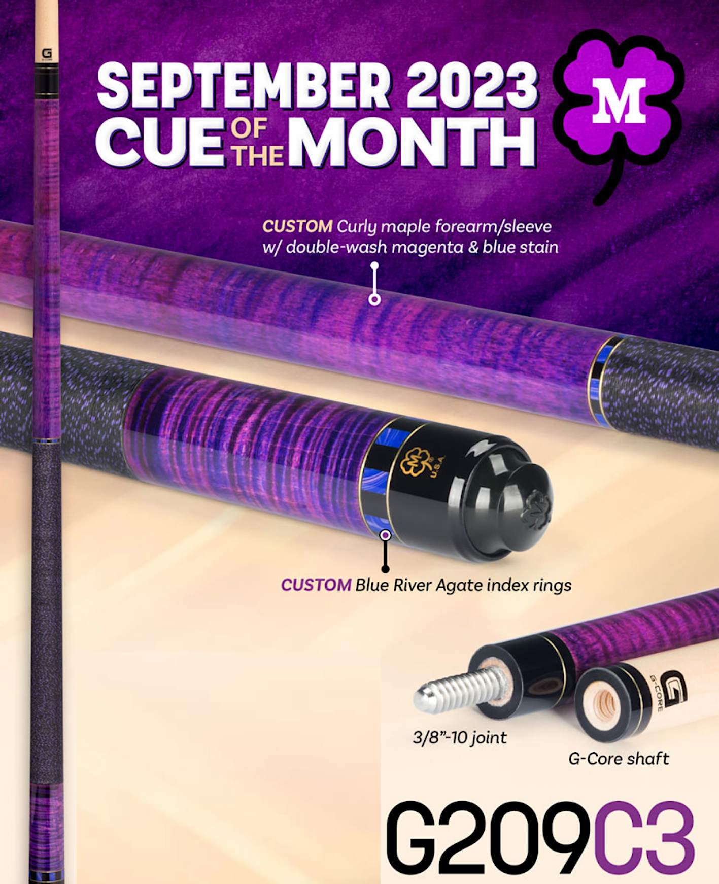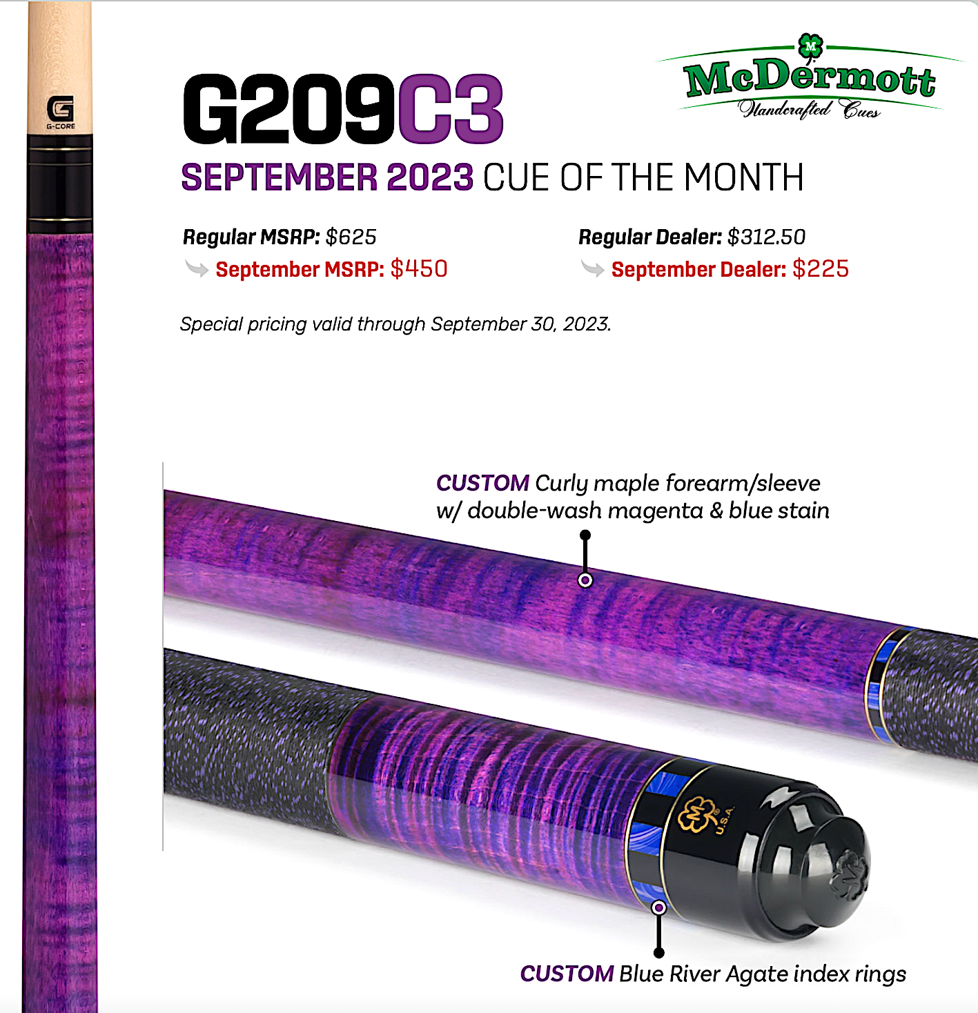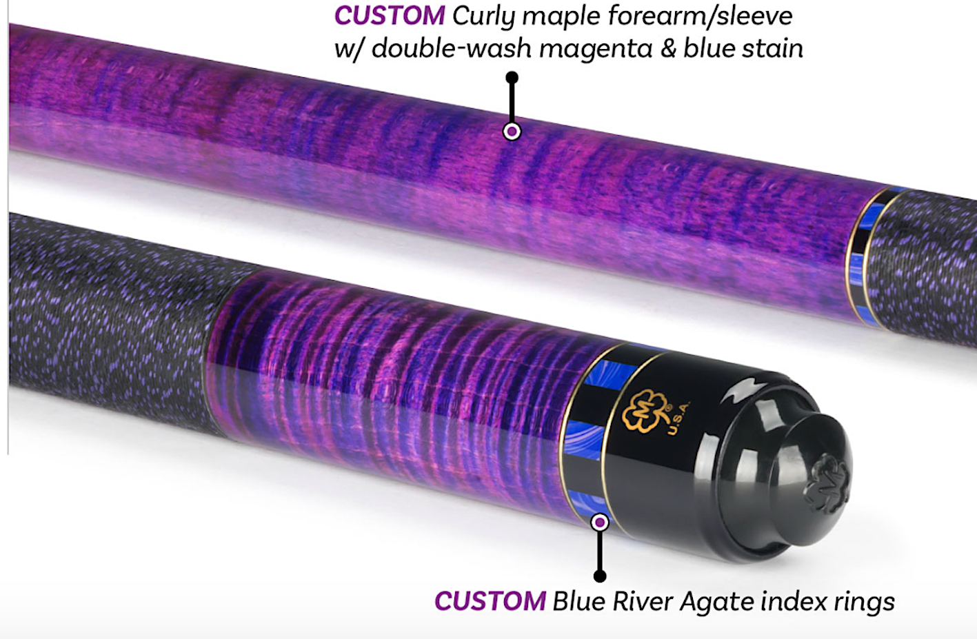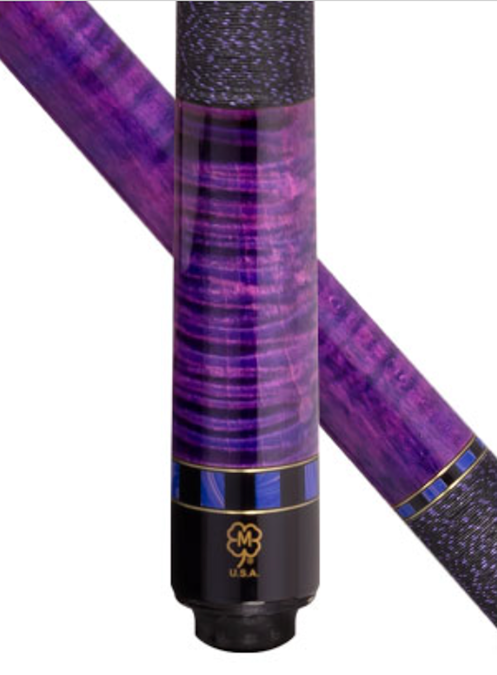 Get a custom cue without the custom price tag. The McDermott Cue of the Month program gives you a chance to own a customized McDermott cue for the same price as the original! Each month, we customize an existing cue with a combination of unique stains, wraps, exotic materials, rings, or a shaft upgrade. The cost to you for these customizations: $0. The McDermott September Cue of the Month features a Curly Maple forearm/sleeve with double-wash magenta & blue stain with Brass and Blue River Agate index rings, and a genuine Irish linen wrap. The G-Core’s Triple-Layer Carbon Fiber Core extends through the first 7 inches of the shaft. This stabilizes the front-impact area of the shaft for increased control and predictability. This technology increases radial consistency, reduces vibration and limits the inconsistencies found in traditional maple shafts. G-Core shafts feature a carbon fiber ferrule core. This technology results in a stronger ferrule assembly with maximum impact properties and enhanced feedback. The red ring at the base of the ferrule acts as a dampener to help absorb shock upon impact. Radial consistency is the shaft’s ability to perform the same way on every shot, regardless of its orientation. The G-Core's Triple-Layer Carbon Fiber Core technology will consistently provide a straighter cue ball path, minimizing the need to compensate for spin and throw. Navigator Black tips feature multiple layers of Japanese pigskin leather that are assembled using a proprietary adhesive. This prevents oxidation, meaning the tip won’t get harder after short usage. They are most adaptable tips in the Navigator line, allowing players to shape and mold the tip over time to fit their play style.
