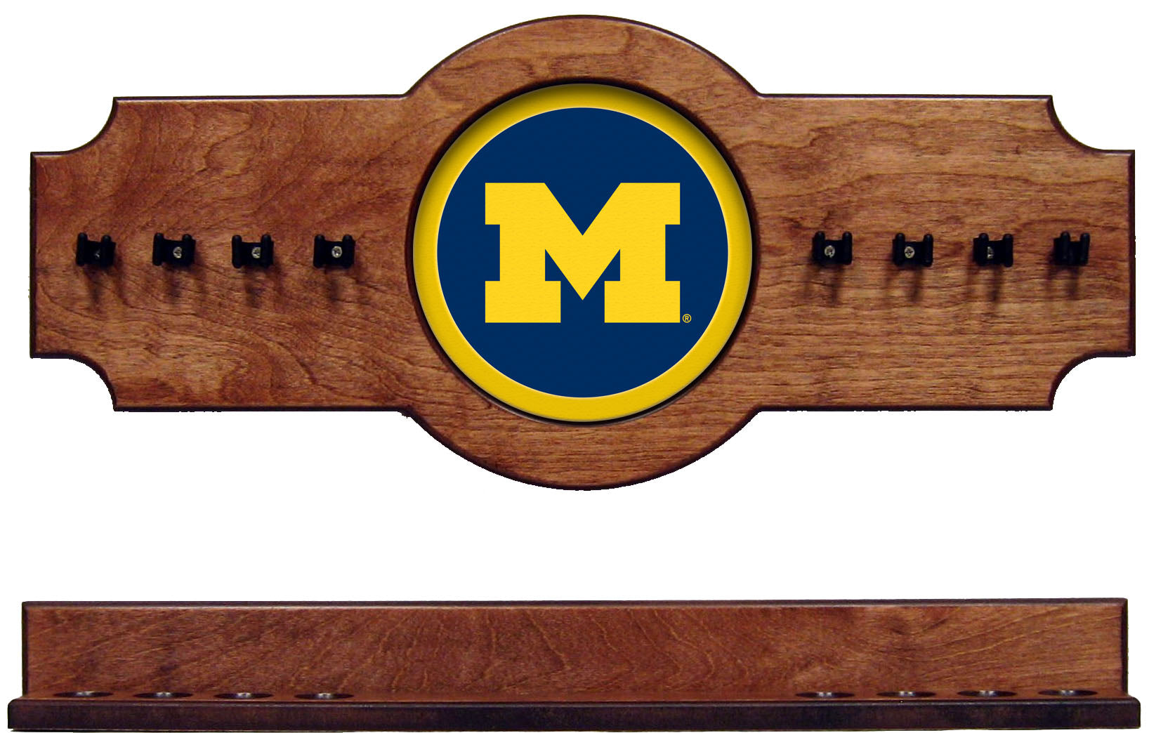 These quality LICENSED COLLEGIATE CUE RACKS are made here in the USA of maple wood and are decorated with a full color laminated school logo. Available in our standard finishes: Pecan, Oak and Black.