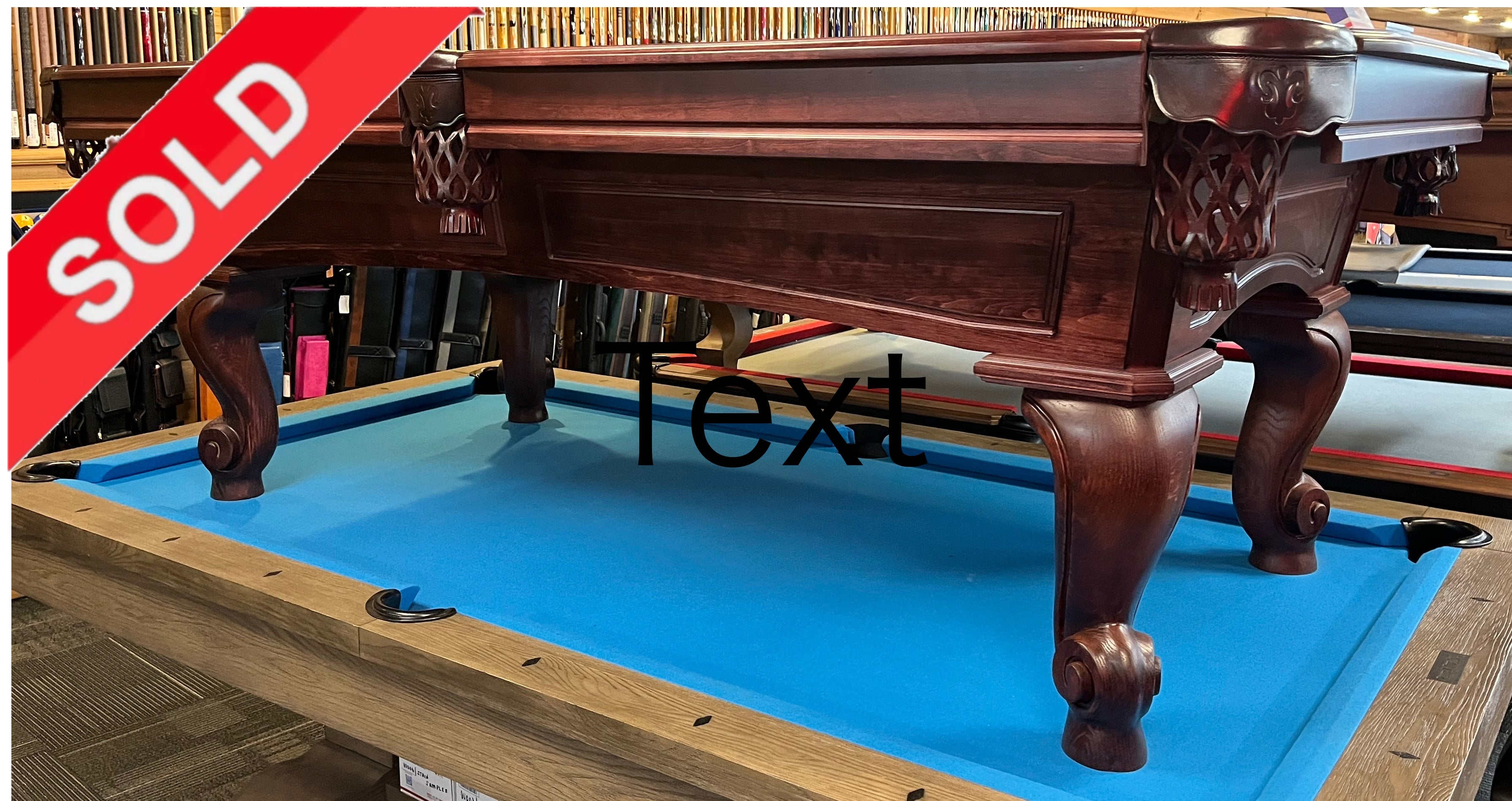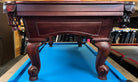 This table is brand new, never been installed, has not even had felt put on it. The model is a Magnolia in a cherry stain and the floor model is the only one we have. This is a gorgeous wood table with rams head legs, cordovan leather shield drop pockets, and white mother of pearl round sights. As always, our price includes your choice of felt colors from our ProLine Classic color palette, a play package with everything you need to start playing, and delivery and installation within a 30 mile radius of Loganville, Georga. If you are not within our local service area, please call for any additional delivery fees.