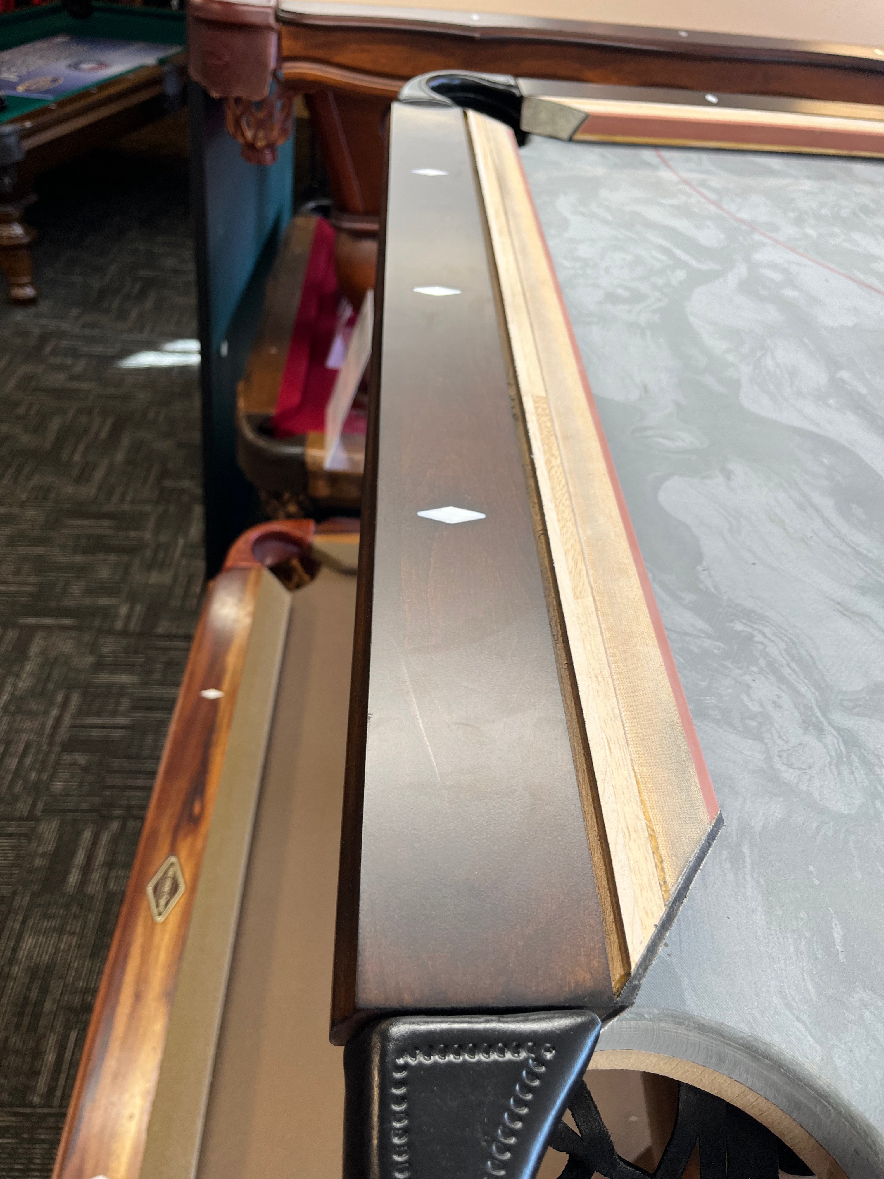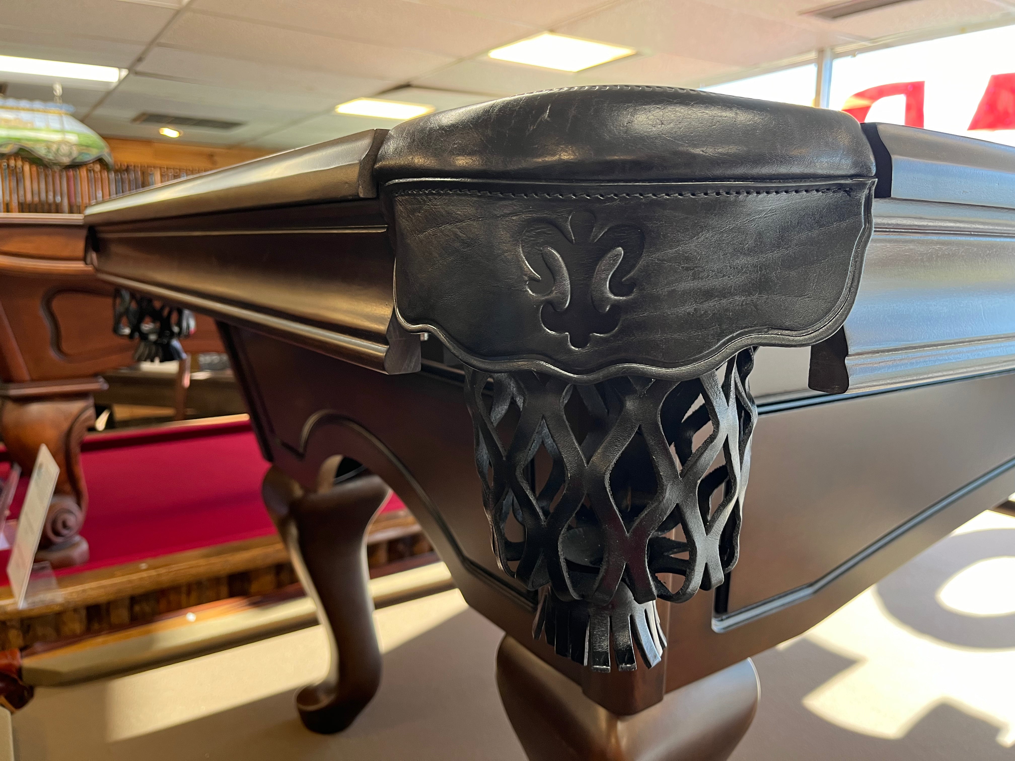 This is only the second time we have listed a brand new table under the Used heading. Original buyer ordered the table and upgraded to a different table before even receiving this one. This table is brand new, never been installed, has not even had felt put on it. The model is an Annalee, and the floor model is the only one we have. This is a gorgeous wood table with Queen Anne carved legs, brown leather shield drop pockets, and white mother of pearl diamond sights. As always, our price includes your choice of felt colors from our ProLine Classic color palette, a play package with everything you need to start playing, and delivery and installation within a 30 mile radius of Loganville, GA. If you are not within our local service area, please call for any additional delivery fees.