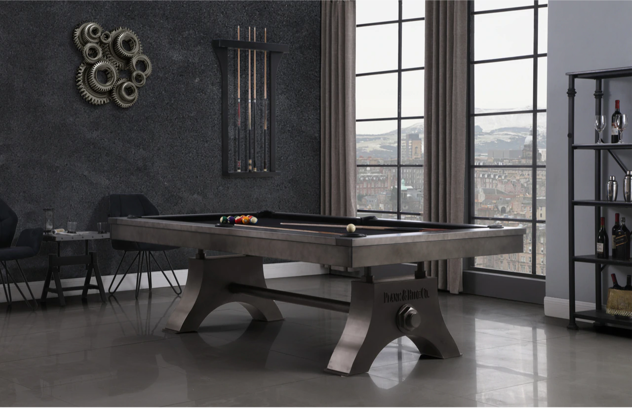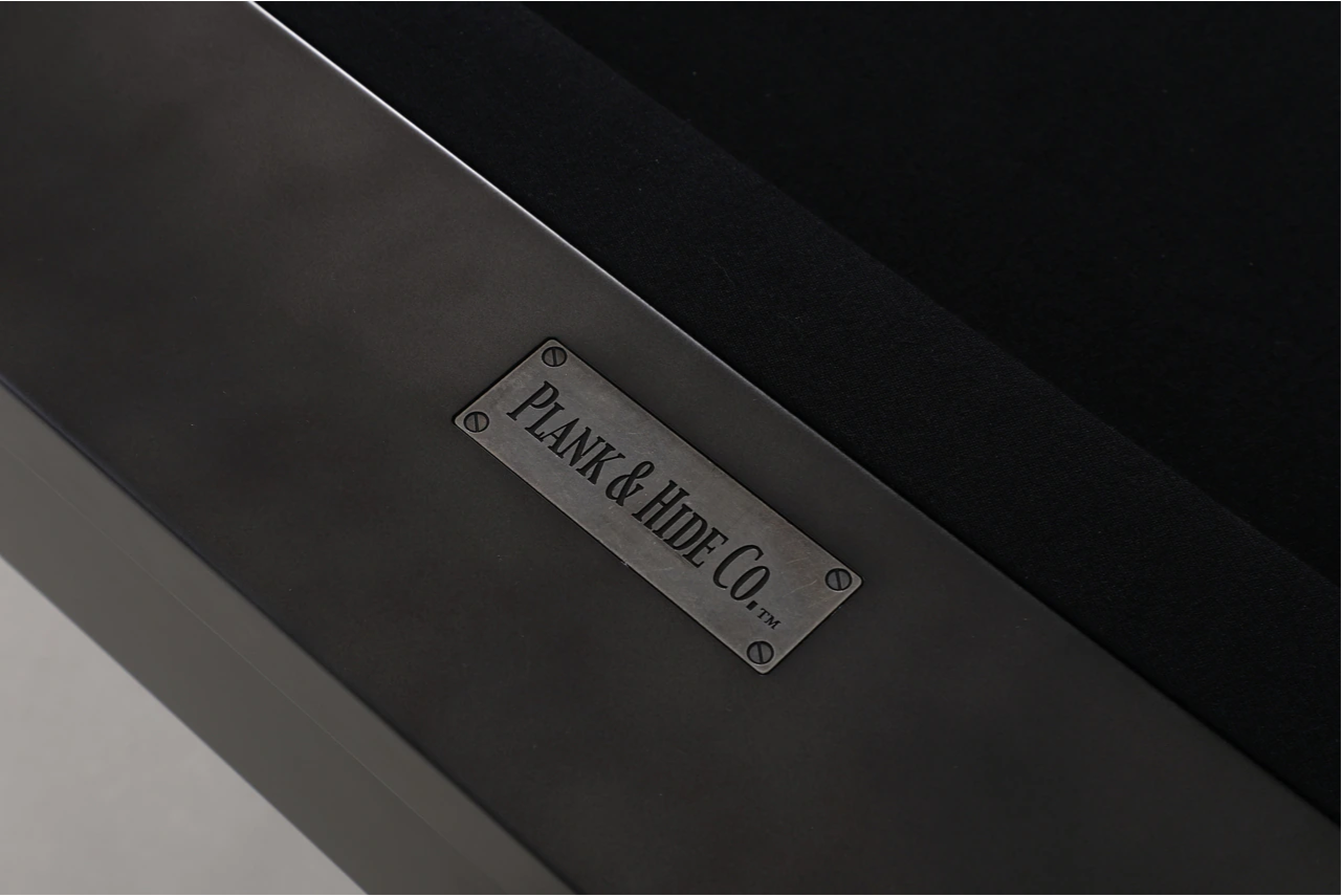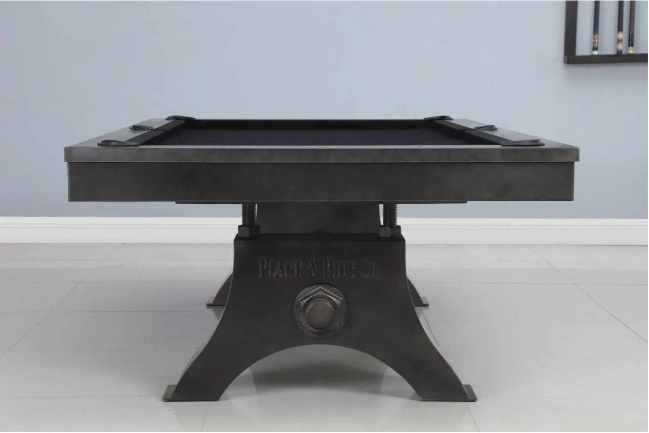 The Plank & Hide Jaxx pool table stands proudly on a 7 gauge steel gunmetal grey frame & base with 14 gauge stainless steel rail caps and aprons.