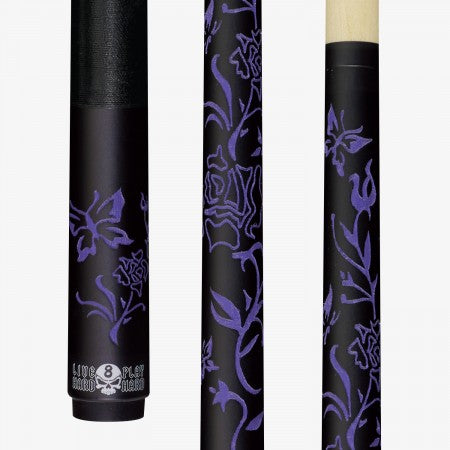 Live Hard Play Hard edition laser-etched cue with matte black forearm and butt, purple laser-etched climbing rose garden design, and solid black Irish linen wrap.