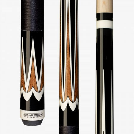 This Players Energy cue features a midnight black forearm & butt with graphic Maple & white classic five-point design, solid black double-pressed Irish linen wrap, slimline butt cap and classic 5/16 x 18 joint.