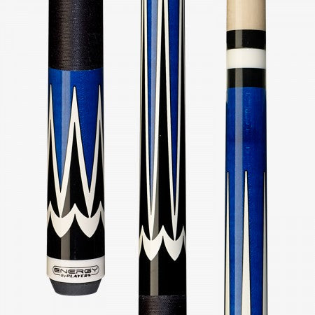 This Players Energy cue features a deep blue forearm & butt with graphic black & white classic five-point design, solid black double-pressed Irish linen wrap, slimline butt cap and classic 5/16 x 18 joint.
