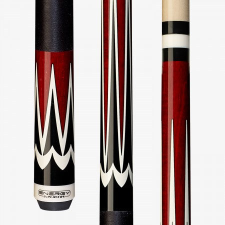 This Players Energy cue features a deep red forearm & butt with graphic black & white classic five-point design, solid black double-pressed Irish linen wrap, slimline butt cap and classic 5/16 x 18 joint.