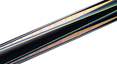 - Four short inlaid points in Black, Indigo, Bright Yellow, and Curly Natural Maple