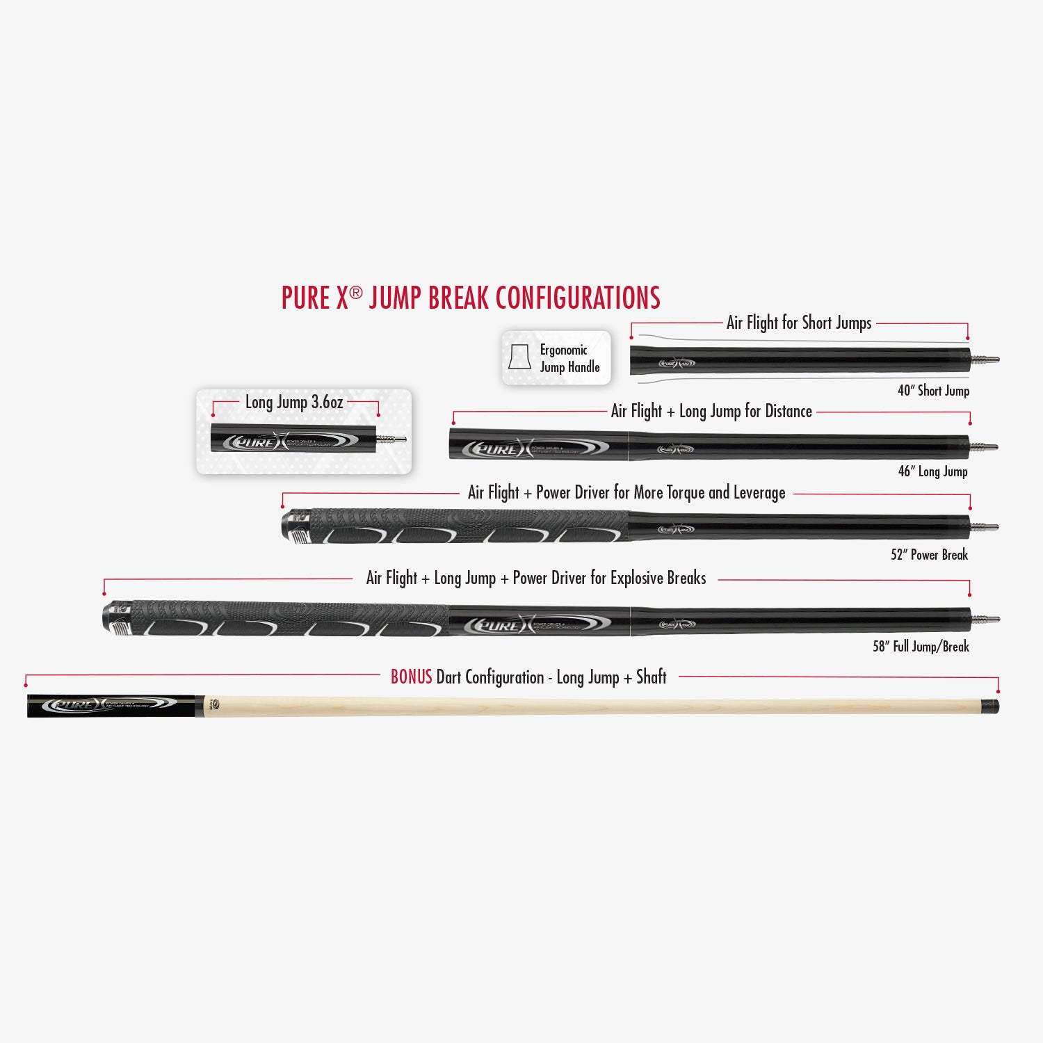 - Five separate configurations - from a 35.5 dart (Long Jump extender + shaft) to a 58 full jump/break (Air Flight jump handle + Long Jump extender + Power Driver with wrap + shaft)