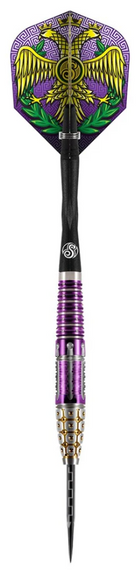 All three Roman Empire barrels in the range feature the meticulous new signature Testudo grip. The centre-weighted barrel is forged in 95% tungsten. Its finely tapered pencil shape features a triple threat combination of Testudo, Gladius and Hilt precision grips. The ultrafine titanium coating in gold and purple gives the ultimate imperial finish. The Caesar dart set features three new distinct grip profiles which allow a multi-level finger reference points along the dart. The barrel nose features the defensive Testudo grip followed by the Glaidus (sword) grip, a strong yet superfine stacked pattern grip with deep axial cuts provides powerful positioning and control. The dart finishes with the Hilt grip, a multi-directional shark grip re-machined to add additional traction, locking the fingers into a no-slip area. Finished in a rich and majestic purple and gold Titanium coating for strength and beauty, 100% designed, manufactured and colour plated at our factory in New Zealand.