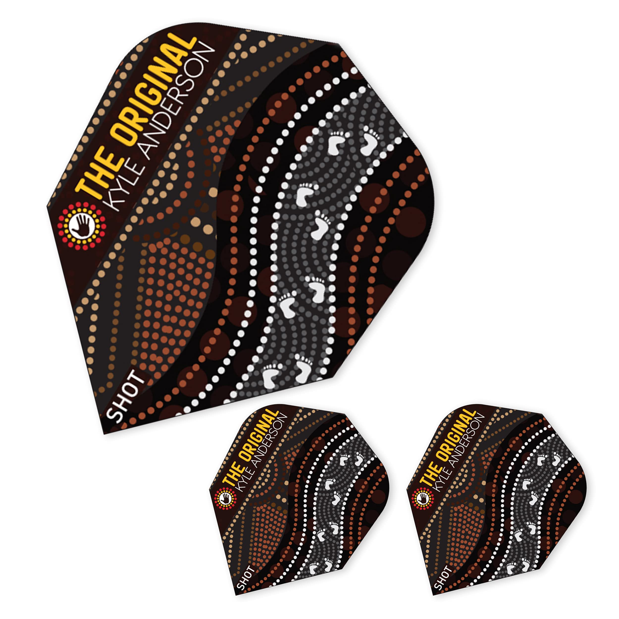 The Shot Kyle Anderson O.G. dart flight set pattern takes its cues from Aboriginal design. The footprint design represents a journey; the roads walked and taken. Shot Darts are finished with distinctive dart flights which are hand drawn and crafted by our in-house design team. Standout graphics echo each individual dart theme perfectly. These small standard 100-micron flights provide maximum lift and stability of the dart when it is in flight.