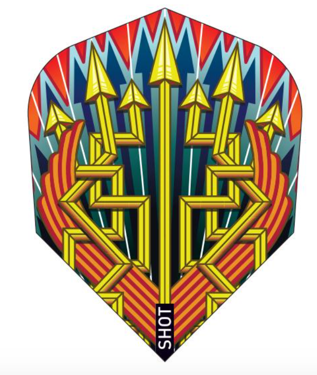 Ancient Roman shields inspired the thunderbolts in this flight design. A symbol of Jupiter, the chief deity, the Roman god of thunder and the sky, they signify protection and success on the battlefield. Shot Darts are finished with distinctive dart flights which are hand drawn and crafted by our in-house design team. Standout graphics echo each individual dart theme perfectly.