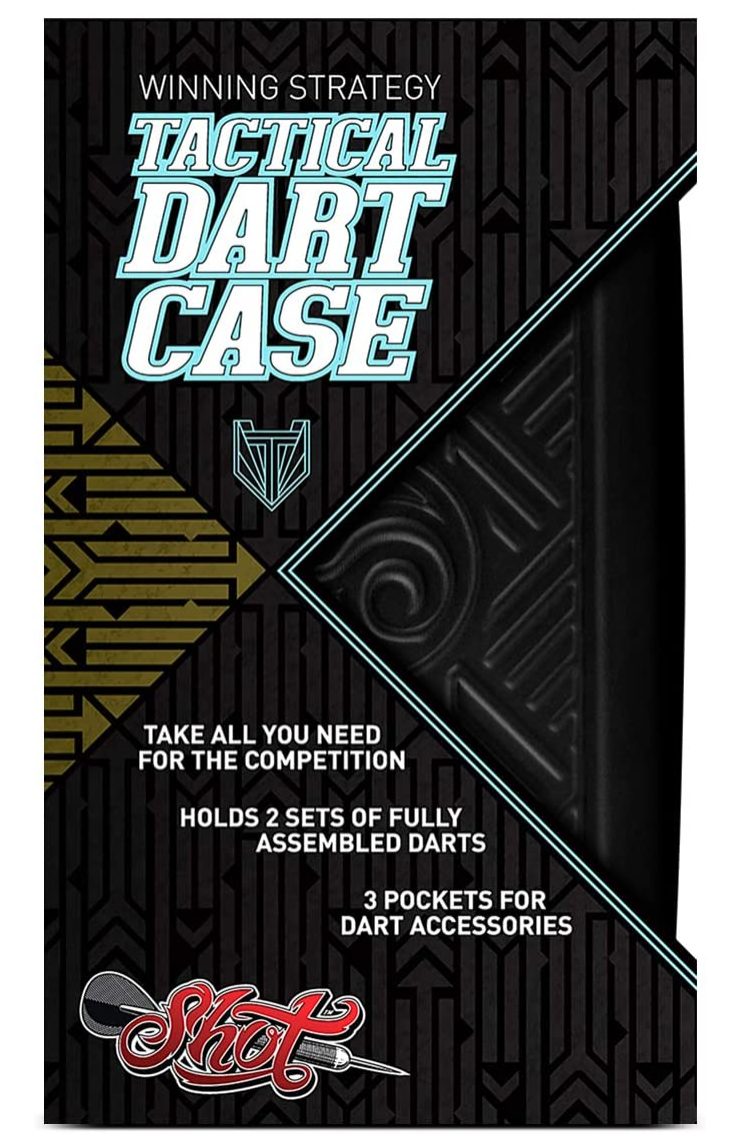 The tough, yet generous 20 x 12cm Tactical Dart Case carries two sets of fully assembled darts without crushing. But that’s just the start. A quality zip closure opens the case like a clamshell. One side has space for two dart sets – great for tournaments, darts sessions with your mates, or spares. Its opposite side has a deep zipped pocket which fits even a plus-sized phone, plus keys and wallet – keeping hands and pockets free as a bird. Two smaller pockets are useful for spare gear: shafts, stems, flights, points… Whatever your need for the night. Protect your precious darts gear like a pro with Shot’s tribal design. This dart case will last but it's packaging won’t. Place it in your recycle bin – and play on. (Not sold as pictured - darts and accessories sold separately)