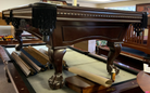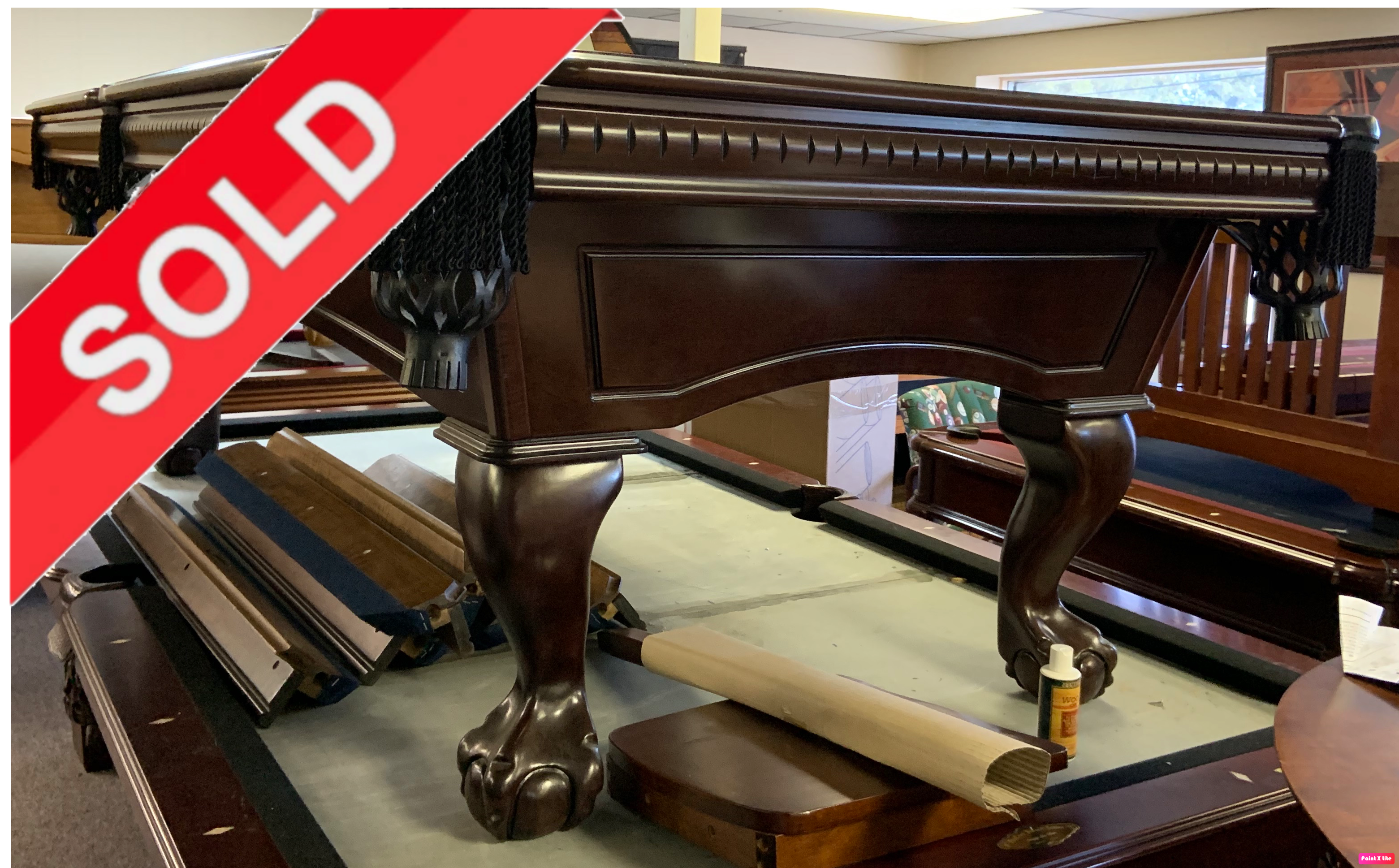 Beautiful dark stain Fischer Duchess pool table with ball and claw legs and black leather fringe drop pockets. Arched, routed frame and notched side aprons really set this table apart. Fischer is defunct, so you won't find any new Fischer tables around! As always, our price includes your choice of felt colors from our ProLine Classic color palette, a play package with everything you need to start playing, and delivery and installation within a 30-mile radius of Loganville, GA. If you are not within our local service area, please call for any additional delivery fees.
