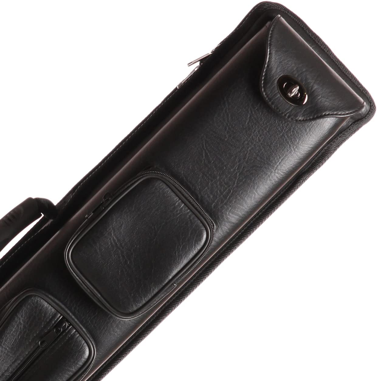 Holds 3 cue butts + 5 cue shafts. Black leatherette. Spring loaded for butts only. Oversized accessory and jump cue pockets