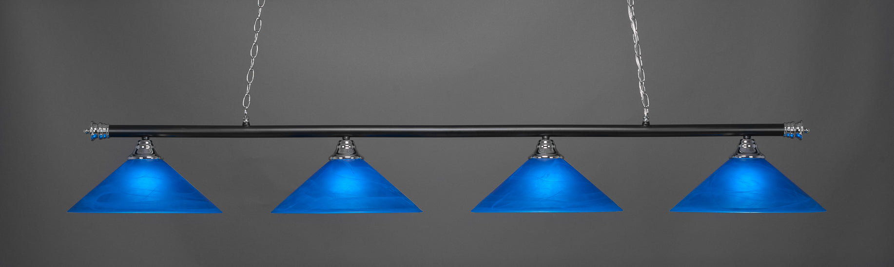 The 374-CHMB-415 light from Toltec is part of their Oxford series and is an excellent non-traditional choice for contemporary billiards table or island lighting. It is rated at 120V for indoor use and is designed for hardwired installation. The 374-CHMB-415 requires 4 Incandescent bulbs. Includes manufacturer 1-year warranty. Some assembly required (instructions included).