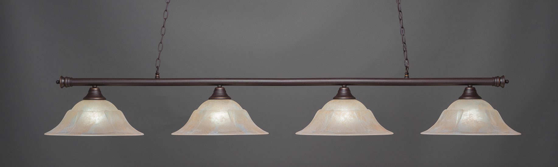 The 374-DG-53613 light from Toltec is part of their Oxford series and is an excellent non-traditional choice for contemporary billiards table or island lighting. It is rated at 120V for indoor use and is designed for hardwired installation. The 374-DG-53613 requires 4 Incandescent bulbs. Includes manufacturer 1-year warranty. Some assembly required (instructions included).