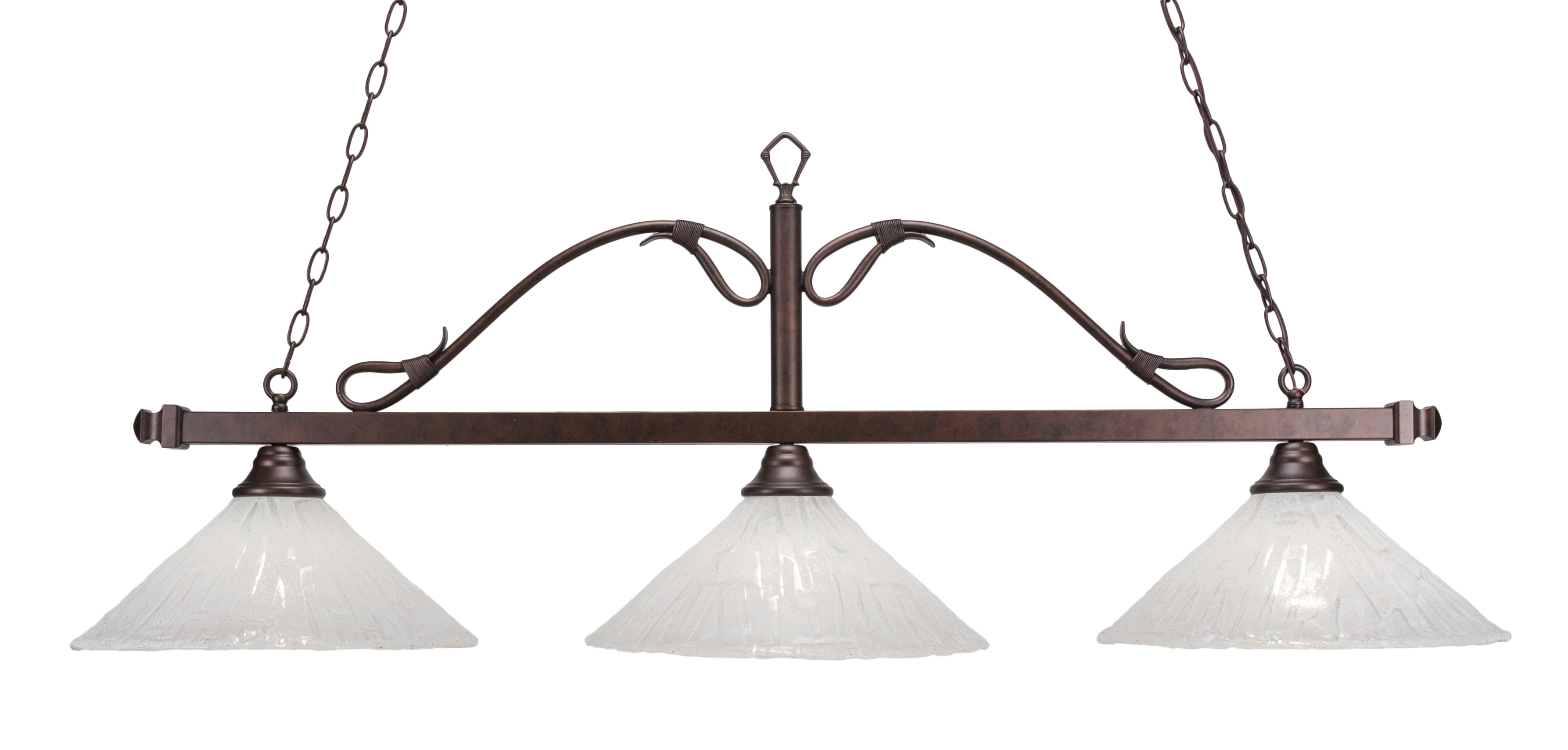 The 823-BRZ-719 light from Toltec is part of their Scroll series and is an excellent non-traditional choice for contemporary billiards table or island lighting. It is rated at 120V for indoor use and is designed for hardwired installation. The 823-BRZ-719 requires 3 Incandescent bulbs. Includes manufacturer 1-year warranty. Some assembly required (instructions included).