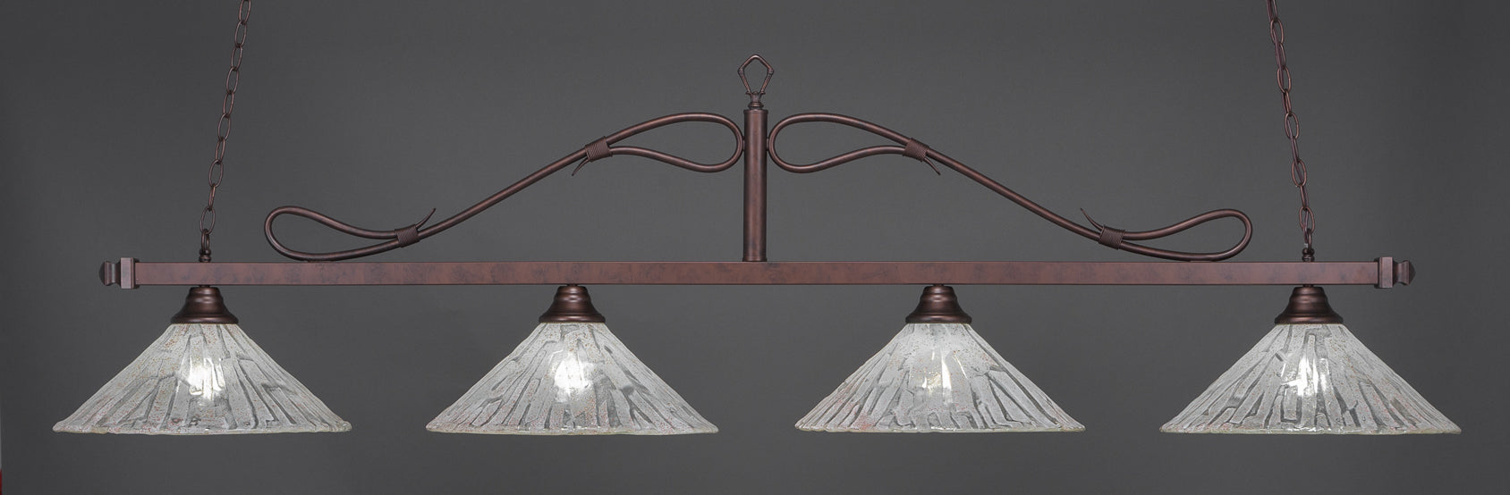The 824-BRZ-719 light from Toltec is part of their Scroll series and is an excellent non-traditional choice for contemporary billiards table or island lighting. It is rated at 120V for indoor use and is designed for hardwired installation. The 824-BRZ-719 requires 4 Incandescent bulbs. Includes manufacturer 1-year warranty. Some assembly required (instructions included).