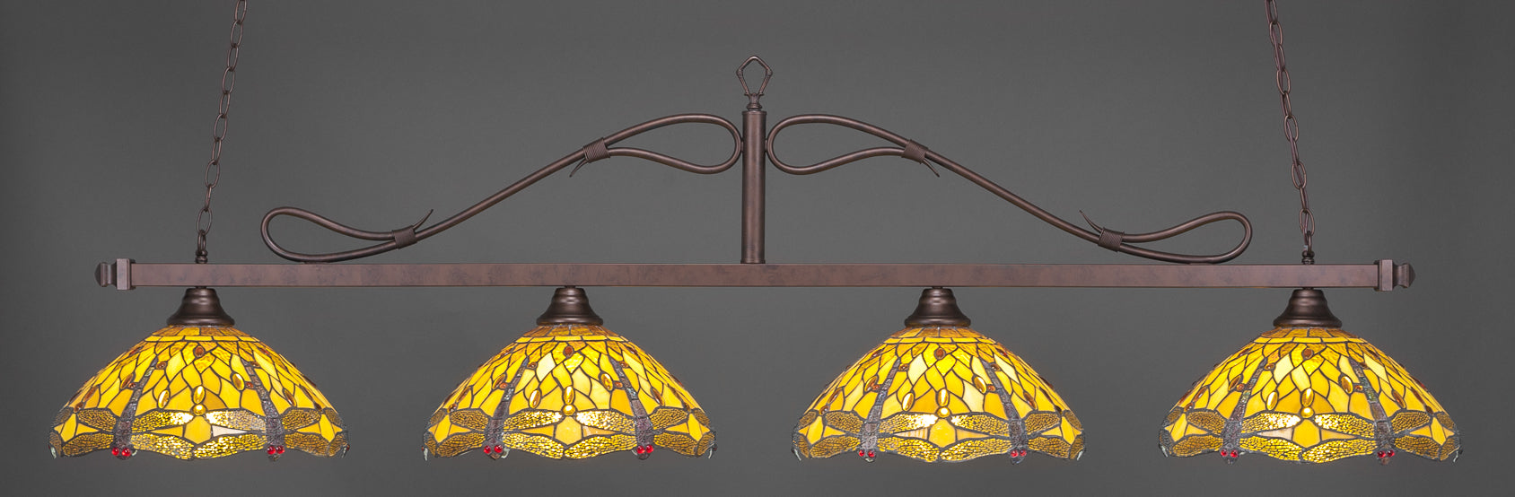 The 824-BRZ-946 light from Toltec is part of their Scroll series and is an excellent non-traditional choice for contemporary billiards table or island lighting. It is rated at 120V for indoor use and is designed for hardwired installation. The 824-BRZ-946 requires 4 Incandescent bulbs. Includes manufacturer 1-year warranty. Some assembly required (instructions included).