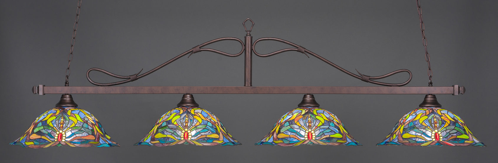 The 824-BRZ-990 light from Toltec is part of their Scroll series and is an excellent non-traditional choice for contemporary billiards table or island lighting. It is rated at 120V for indoor use and is designed for hardwired installation. The 824-BRZ-990 requires 4 Incandescent bulbs. Includes manufacturer 1-year warranty. Some assembly required (instructions included).