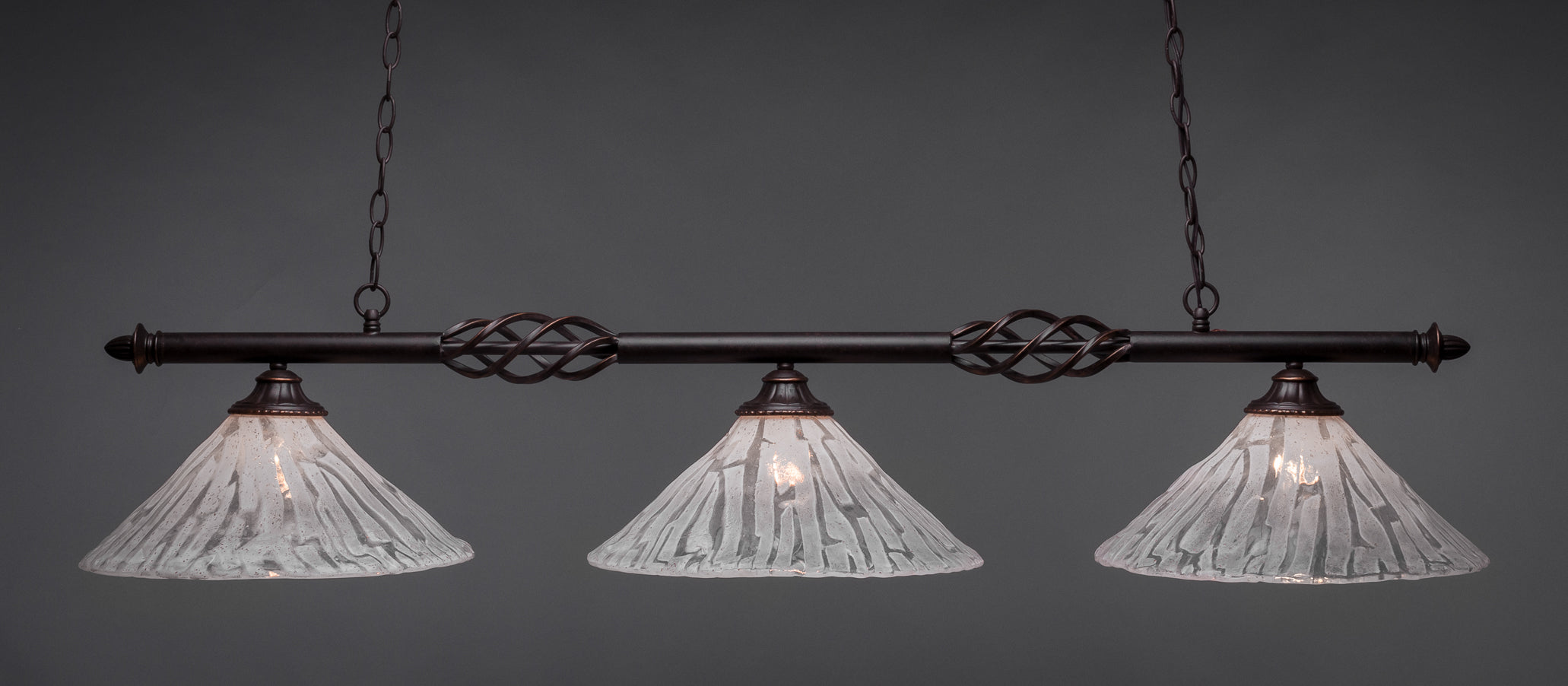 The 863-DG-719 light from Toltec is part of their Eleganté series and is an excellent non-traditional choice for contemporary billiards table or island lighting. It is rated at 120V for indoor use and is designed for hardwired installation. The 863-DG-719 requires 3 Incandescent bulbs. Includes manufacturer 1-year warranty. Some assembly required (instructions included).